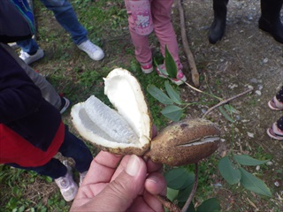 パカリと口をあけているアケビに「あまい」「おいしい」と声が上がった。まだ、樹木は色づいていなかったがヒメジョオンやミゾソバ、イヌタデ、ヨメナなど色とりどりの秋の野の花を楽しむことができた。 (記・竹内秀)