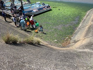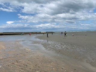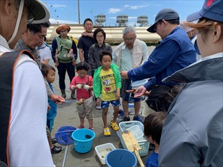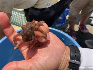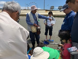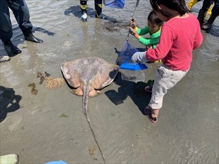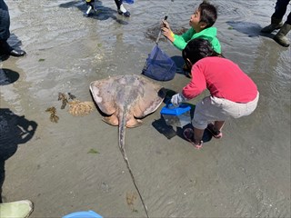 砂浜に打ちあがっていた大きなエイに驚いたり、アオリイカの卵を触って「ぷにぷにだ。」と楽しんで自然と触れ合っていました。 午前11時頃より採取した海の生き物の説明を聞いたのち、生き物観察会は終了となりました。