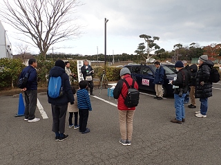 美浜町総合運動公園の駐車場に集合、受付・挨拶のあと、鵜の池に向かって出発です。