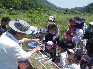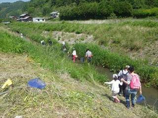 晴天で暑い日となりましたが、子どもたちは元気いっぱいで魚を取ると張り切っていました。集合場所の旧山海小学校からは徒歩で田んぼ周辺の自然の観察、また、周辺の用水路で生き物を捕獲しながら山海川まで進みました。用水路ではたくさんのカダヤシを取ることができました。ダルマガエルやタニシも観察することができました。
