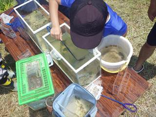 わかちあいではウナギの成長過程、貴重なアユの生態、汽水域で成長するセイゴやボラの生態に興味を持ってもらえたようでした。皆一様にキラキラした眼差しで説明を聞いていました。(記:中村英)