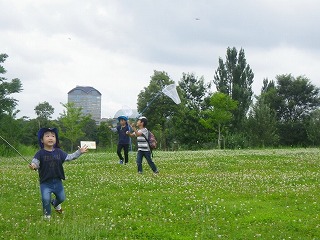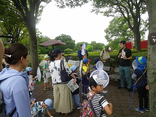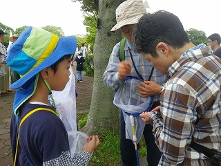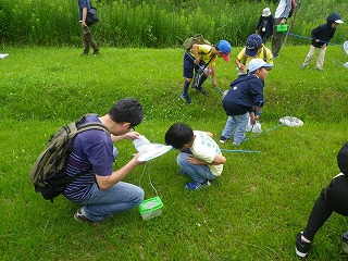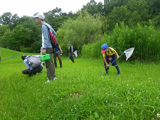 【左】獲物は虫かごへ 【右】薬草園の芝地でトンボ捕り