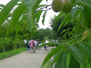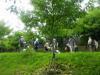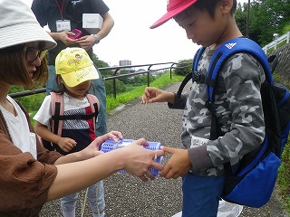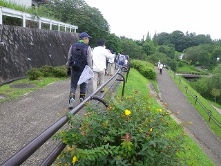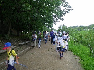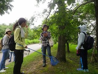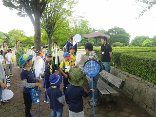 【左】環境課職員から挨拶 【中】知多自然観察会から諸注意とお願い 【右】いつもの坂道、ショウリョウバッタ捕りで前へ進まず