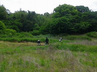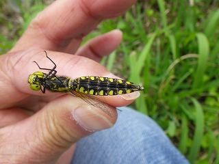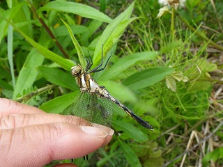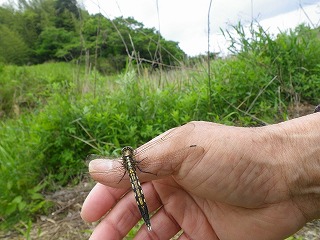 井間池・高砂山へ移動後、昨日からの強い南東風(10m/s)が吹き止まず、虫たちを見つけるには難しい観察会になりました。草地では僅かですが、シオカラトンボ、ハラビロトンボ、バッタの仲間を捕らえて観ることが出来ました。