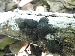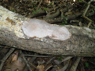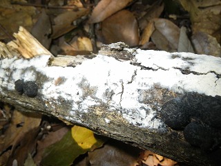 【左】コウヤクタケの仲間 【中】クロコブタケ 【右】朽ち木で繁殖する菌糸