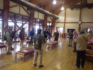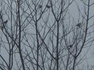 【左】遠くの高い木のてっぺん枝に十羽のツグミ 【右】終わりの挨拶と鳥の確認