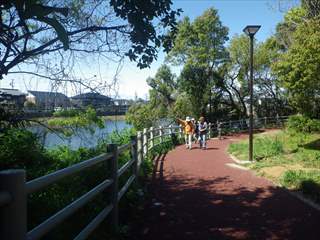 まず、工事が終わって3月28日から供用が始まったばかりの宮池エリアを巡りました。宮池の周囲を巡る、あるいは池の一部を横断する遊歩道が新たに整備されました。水際まで近づけるので間近にコイやフナの泳ぐ姿が見えました。前日かなりの降雨があったので池の水位がかなり上がっていたようで、その分普段よりも水面が近かったかもしれません。