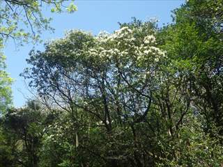 【左】手前の白っぽい木(クロガネモチ)の日当たりにオオワラジカイガラムシがイッパイいてビックリ。
