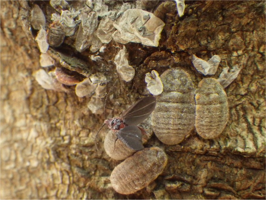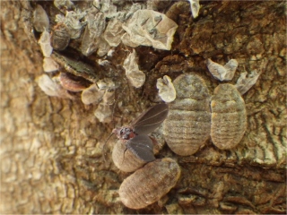 【左】クロガネモチの幹。太陽と反対側(日陰)のゴツゴツ部分。羽のある昆虫は♂(オス)。脱皮殻もある