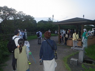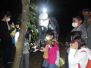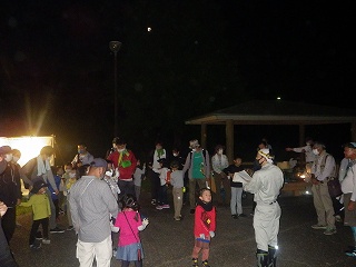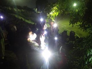 担当指導員の「虫さんは見るだけで捕らない」というお話は例年通りのことであったが、今回は、「虫は捕らないのでタモ(捕虫網)はここ(集合場所)に置いて行きましょう」ということで出発。このことは、結果的には物凄くよかった。と言うのは、今までは、歩行時にタモ網の柄を横に振りながらの歩き方を途中で何度もしていたが、今回は、その必要がなくナイトハイクが楽しめた。特に、林の中では、かえって、邪魔になりがちだったのでそれも解消できた。