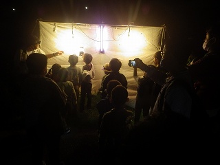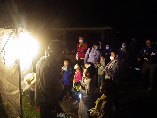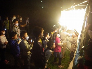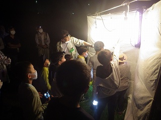 誘蛾灯による灯火に集まった虫は、今回は、まったく種類も数も少なかった。それでも昆虫好きな子供たちは嬉しそうにキャッキャと虫さんを指さしながら説明する指導員に色々聞いていた。虫の種類や数が少ないのは、今夜が満月の晩だったせいであろうということにした。