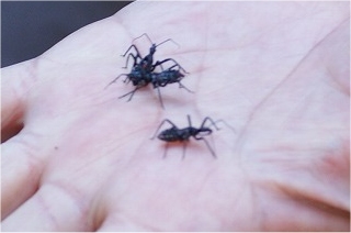 【左】太いエノキの幹の北側に黒い"かたまり"  【右】かたまりの一部を手のひらに載せた→動きだした