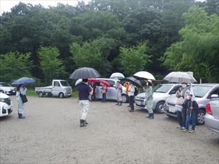 1週間雨ふりあげくの土曜日。朝から雨が降ったりやんだり。集合時間にも雨がバラばらっとふってきて、町主催の観察会は中止となった。しかし、コロナウィルスで中止続きの観察会がやっと開催できるようになったことと夏の虫(カブト、クワガタ)を見つけたいという2重の期待が高まり、中止を聞いて帰るのは町職員のみ。ほかの参加者は小雨の中、タモをもって傘をさしたりカッパを着たりしての自由度の高い観察会となった。