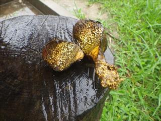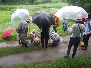 おたまじゃくしからカエルになったばかりの小さなカエルも見られた。雨の中、コナラの樹液か雨の雫かといった幹のぬれているところを探しながらお父さんと子どもが頑張って木を回ってカブトを一ぴきゲット。ナナフシを見つけたお父さんもいて、その珍しさを指導員から聞くと、カブトムシを捕った子がナナフシがぼくもほしいなあと言う視線。でもこれは運ですね。今とれるカブトムシもレアものといわれてちょっと安心。といった、様々な子ども模様?(心境)