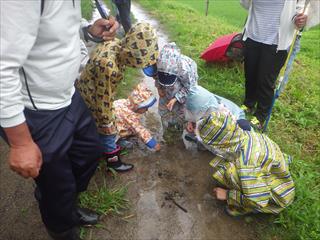 【左】雨は本降りとみなし中止を決定。以後、各自の責任で入場  【右】小さなカエルの観察