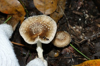 【左】キノコは豊作 【右】本日の最大茸 シロオニタケモドキ