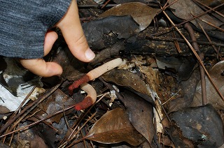 【左】アラゲキクラゲ 【中】コウジタケ、モリチャバネゴキブリ多数 【右】キツネノエフデ