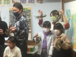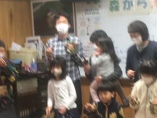 小枝は主にクスノキの落枝、そして丸いリースのはシダレヤナギです。ドングリも拾ったり.さまざまな小枝や素材も拾ったりして楽しそうでした。