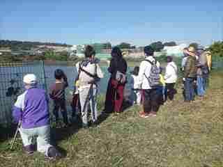 爽やかに晴れ渡り、観察会日和の日となりました。南知多道路のインターチェンジ新設工事が佳境を迎え、重機が行き交い騒音が響く中であったが、中山新池では多くのカモ達が羽根を休めていました。観察道中にはヌルデやハゼの葉が紅葉し、カラスウリやヤマブドウ、ツルウメモドキ等の実が色づき、秋の景色に彩りを添えていました。