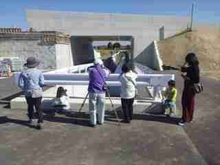 【左】IC新設工事現場を横切る   【中】ガガイモの種子飛ばし   【右】小さい子には指導員が抱っこ