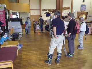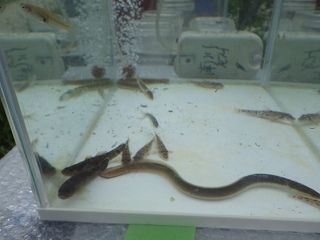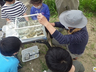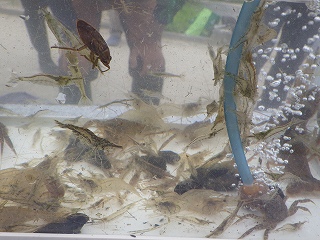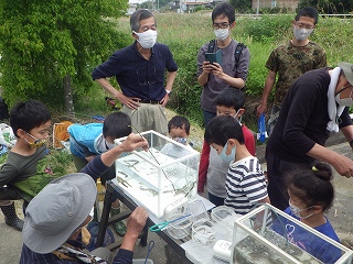 参加者が捉えた魚等の生き物をミニ水槽に入れてしばらく各自観察し、その後、指導員の田中氏による魚類等捕らえた生き物の名前や名前の由来の説明を受けました。