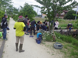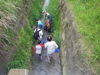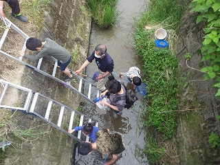 現地では観察会員のサポート得て梯子を使い安全に川に降りる。川に入ると参加者の皆さんは、草の茂みの下等を盛んに、ジャバジャバと踏み込んでタモで獲物を求めるていた。何が入っているかなと、興味深々で活動し、