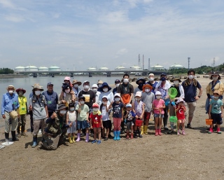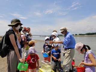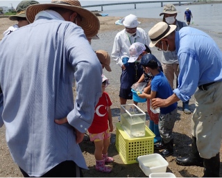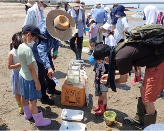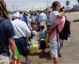 参加者の皆さんは潮が見る見るうちに引いていく中での海辺の生き物探し、アサリにも興味津々で砂堀りや岩陰探しを楽しんでいました。また、指導員が参加者の子供たちと一緒に四手網の操作と魚などの追い込みを行い、上げた四手網の中の魚に歓声を上げていました。
