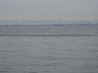 海上には多くの種類のカモたちの群れがあちこちに浮かび、浜辺には一本足になって羽を休めているマガモやカルガモの姿が見られました。