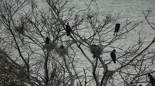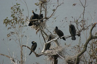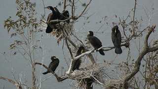 【左】カワウ営巣   【中】カワウの糞で白くなった樹木   【右】カワウ子育て