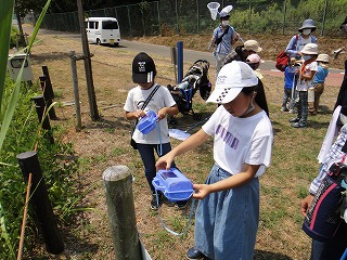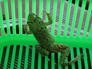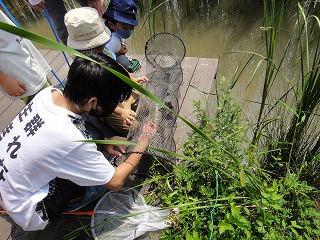【左】いっぱい捕れたよ 【中】水辺の生きもの探し 【右】ウシガエルがトラップに捕らわれていた