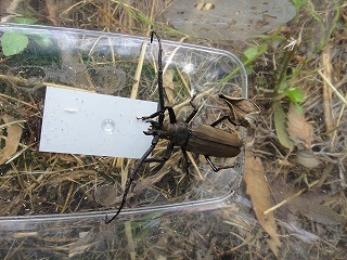 【左】ミヤマカミキリ 【中】籠の中(カブトムシ、カナブン、ノコギリクワガタ) 【右】コクワガタ