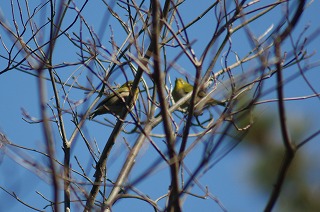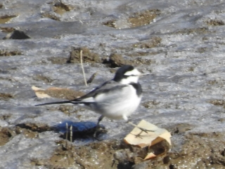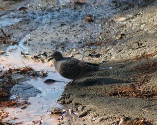 【左】木陰の野鳥を探す 【右】大田大池は枯れ池状態、ハクセキレイ、キジバトがいた。