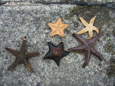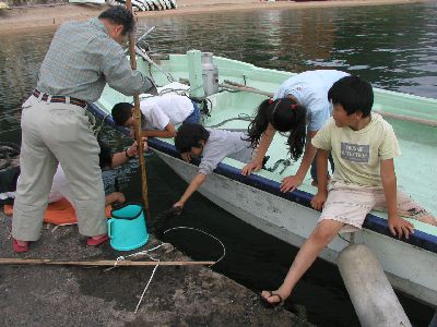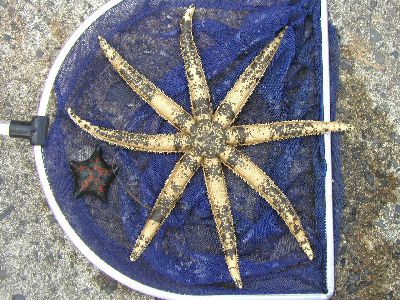 朝は朝でまた同じ突堤で観察。オハグロベラ、キュウセン、キヌバリ、ゴンズイなどの魚、海面近くの小さな稚魚。海藻はホンダワラ、ウミウチワ。朝のメーンイベントは30cmほどもあるヤツデスナヒトデの捕獲大作戦。網はぎりぎりのところで届かないしヒトデは突堤の穴に逃げ込もうとするし、長い棒で引っ張り出して人間の勝ち。2日目のスケジュールを消化すべく常神半島へ向かう。