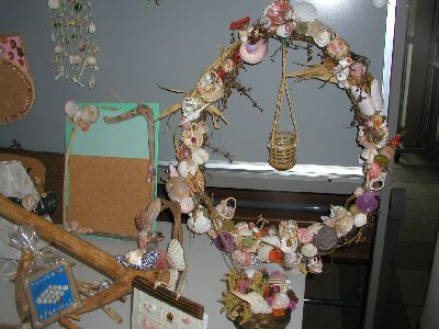 【左】若狭三方マリンパークの中に、貝で作った飾りがありました。