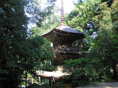 そして、最後の観察ポイントである「明通寺」にはいる。明通寺は本堂と三重塔が国宝の真言宗のお寺でユズリハの巨木で作ったといわれる薬師如来など三体の彫刻像が有名、境内には今もユズリハがあった。寺へ入る前の階段に5mmくらいの見たことのないクモを発見、銀色に光る尻に黒い模様。珍しいと思ったが進むうち何匹も遭遇。ここではポピュラー種らしい。その他樹齢500年のカヤノキや珍しいところでカミヤツデ、クラマゴケなどの植物あり。ここでもやはり子供たちは川遊びに熱中。寺を降りてくるとアブラハヤ、カジカガエル、サワガニ、ナベブタムシを捕らえていた。カワトンボの舞う清流と山中にひっそりとたたずむ古刹は心洗われる最後の良い観察地であった。