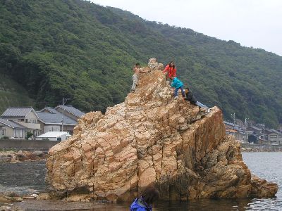敦賀半島を北上し立石の海岸で観察を実施する。漂着物にハングル文字を見つけ改めて朝鮮半島が近いことや今話題の拉致問題に思いを馳せる。が、子供たちはさらに元気。アメフラシやミズクラゲを捕らえ、岩を駆け上がりetc、etc、大ちゃん、まだ裸を寒いよ〜。ここではまずカメノテを試食(これは牧野だけ)、アカクラゲ発見、カニはイワガニのみ、カサガイもベッコウカサガイ、ヨメガカサガイ、アオガイ程度で知多の海よりかなり種類は少ない。浜辺の植物はクサスギカズラ、花が咲いるマンテマやハマヒルガオ、ハマボッス。シンゴくんから蝶がいっぱいいるとの報告を受けついていくと、20〜30匹はいると思われるアサギマダラの乱舞、映画のワンシーンか天国に迷い込んだような幻想的な世界が広がる。アサギマダラは、ここでハマボッスの花の吸蜜をしていたようだ。アサギマダラ大撮影大会となるが、なかなかモデルは思うようにポーズをとってくれない。畠氏は20枚以上のフィルムをここで費やしたと思われる。ファンタスティックワールドに後ろ髪を引かれながら今日の宿へ移動する。