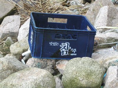 【右】ハングル文字のプラスチック容器が流れ着いていました。