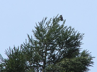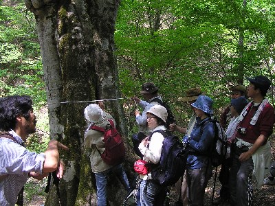 【左】芦生の森の最大のブナの木で計測しました。 【右】オオルリがアシュウスギのテッペンでさえずっていました。アシュウスギの先は丸いのが特徴だそうです。