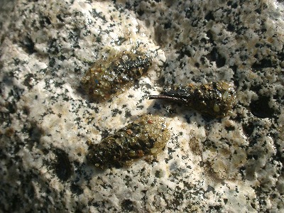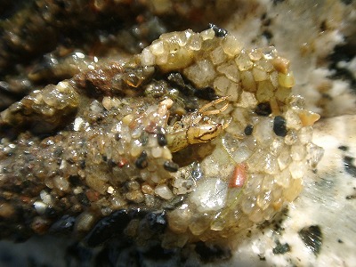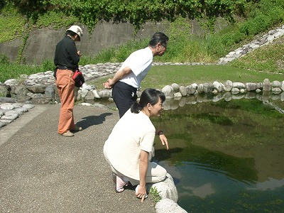 【左】2,3びき捕まえて、池の縁の花崗岩の上にのせたところです。