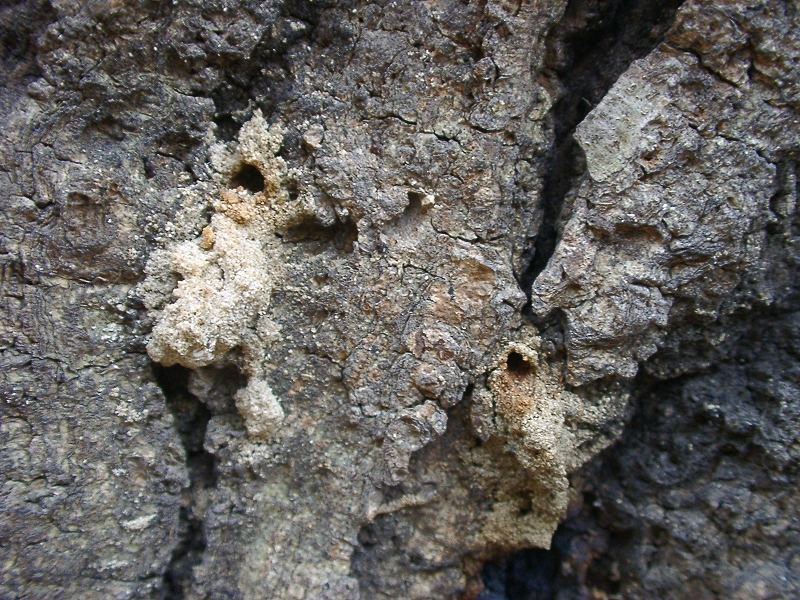 【左】カシナガによる穴(穿孔)の下には