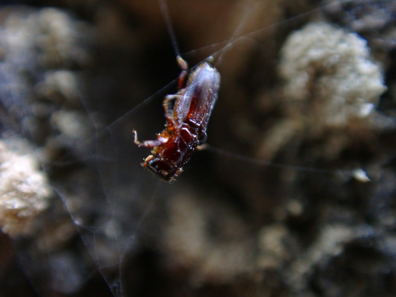 【左】クモの糸に引っかかっている-いつから??? 【右】手前が尻でした(取り出して確認)