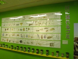 【左】漂着物を利用した作品  【右】川に流れるゴミの展示