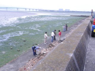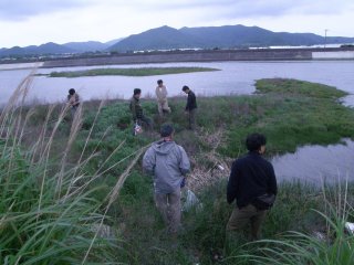 日本屈指の渡り鳥の飛来地である汐川干潟。ここでは、貝の採集、漂着物の収集、小魚捕り、鳥の観察など、個人の興味のまま行動する。貝類は、ヘナタリ、カワニナなどの巻貝が泥地の上に、泥の中には二枚貝のオキシジミガイがたくさんいた。漂着物は、ハスの実やヒシの実、クルミなどの木の実、鳥は、アオサギ、ダイサギ、カワウなどがいた。汐川干潟と水平に走る用水路には、スクミリンゴガイの卵がびっしり水路壁についていた。貝自身は、生きたものを発見することはできなかったが、殻が何個か浮いていた。汐川に面したコンクリートの道路の上では2m近くはあろうかと思われるアオダイショウの脱け殻を見つける。少し移動した泥地では、ヤマトオサガニがたくさんいた。彼らの動作は緩慢で素手で捕えることもできたし、カメラモデルとしても優秀であった。