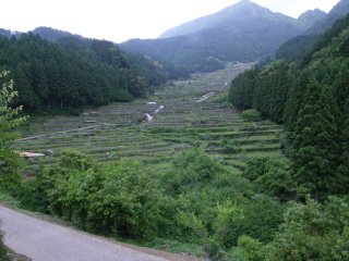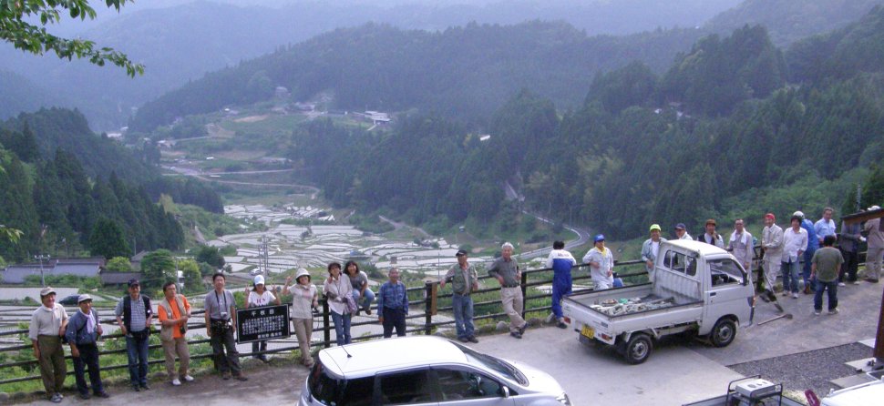 この棚田の保存に当たる中心人物の小山氏の解説を受ける。「日本の棚田100選」に選ばれた四谷の千枚田は、鳳来町の鞍掛山の麓に広がる。新しくできた棚田全体を見下ろすことができる場所からの眺めは絶景。田植えを終えたばかりの棚田は、空の色を反射して一枚一枚が白く浮き上がる。この美しい景色が未来に残ることを切に願う。(記・牧野)