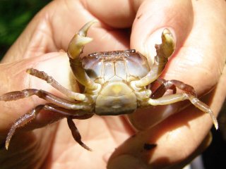 【左】川の生き物観察  【右】赤ちゃんを持ったサワガニ