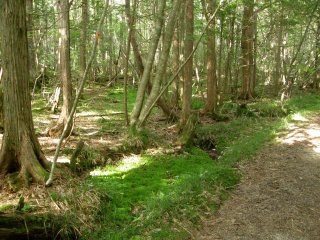 【左】アテビ平小鳥の森の湿地帯  【右】バンガローに宿泊した人たちが見学に来ました。