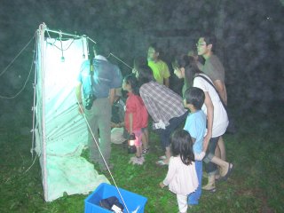期待したとおり、清流に住む生き物を十分に観察することが出来、時間に余裕があったので「長野県売木村アテビ平小鳥の森」もハイキングすることが出来ました。灯火採集の場所は、長野県根羽村茶臼湖の近くで行いました。位山のときほどではありませんでしたが、平地での観察のときに比べれば数、種類とも雲泥の差でたくさん見られました。バンガローを私たちの他2、3世帯の家族が利用していました。一般では、比較的少ない灯火観察でしたので皆さん見学に来られ楽しんでいかれました。