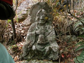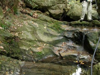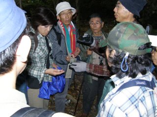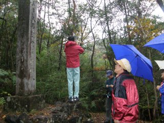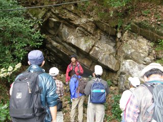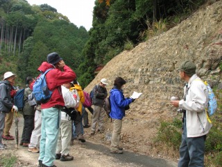 【左】"行者越え断層"の前で、断層ではないことの説明を聞く