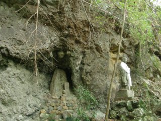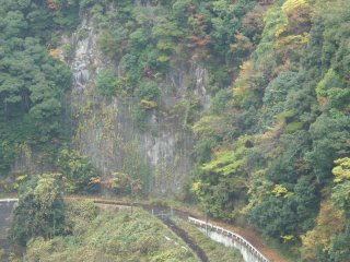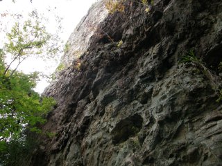 【右】大島地区に見られる流紋岩質溶結凝灰岩の大岩壁