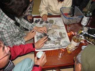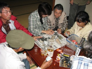 【左】鉱山後・安山岩の貫入の観察 【右】宿で採集岩石の確認